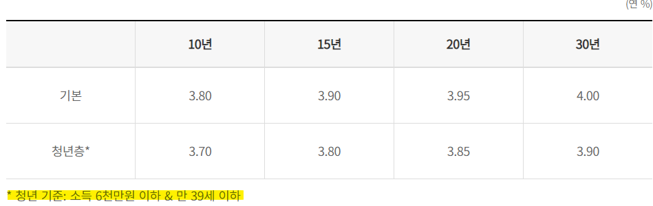 기간에 따라 금리가 3.8~4%로 차등적용되며 청년층에 해당하는 경우 0.1% 포인트 낮은 금리가 적용됩니다.
